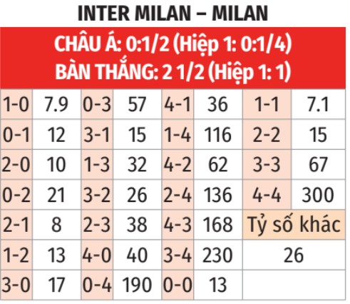 - Từ 2 đến 3 bàn: Cả 4 trận chính thức gần đây của Inter và 6/9 trận chính thức vừa qua trên sân khách của Milan đều có từ 2 tới 3 bàn thắng. Quan trọng hơn nữa, cả 5 trận derby Milan gần nhất diễn ra trên sân San Siro/Giuseppe Meazza cũng đều khép lại với tổng bàn thắng rơi vào đoạn từ 2 đến 3.