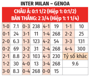 - Inter sạch lưới: Inter sạch lưới cả 5 trận Serie A gần đây khi nhường đối phương 1 ¼ đến 1 ½ bàn. Ngoài ra, Genoa chỉ ghi đúng 1 bàn trong 9 lần gần nhất gặp Inter tại Milano, đồng nghĩa với việc Nerazzurri sạch lưới tới 8 trận trong số này.