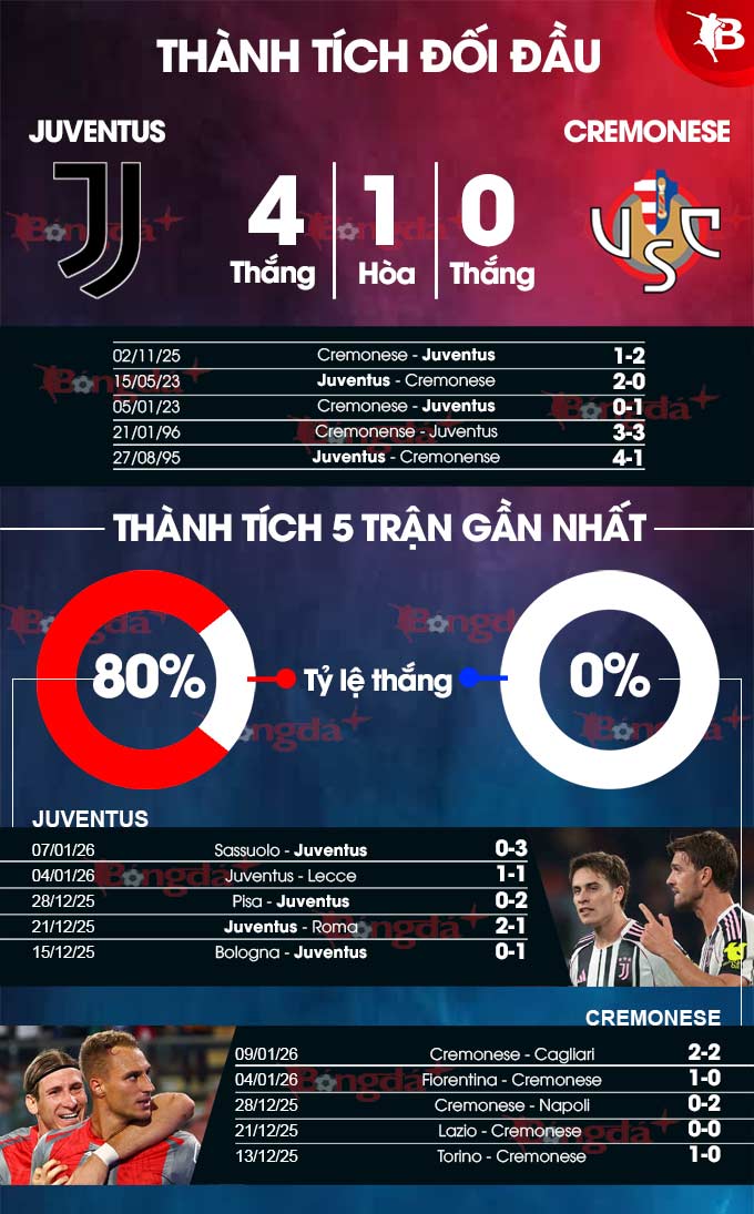 Với phong độ ấy, Juventus có lý do để tự tin tiếp đón Cremonense, đặc biệt khi họ có sự cổ vũ của CĐV nhà. Nên nhớ rằng, đội bóng thành Turin cũng đang thi đấu ấn tượng trên sân nhà. Theo thống kê, họ bất bại 18 trận gần đây khi tiếp đón các đối thủ, trong đó giành 11 chiến thắng.