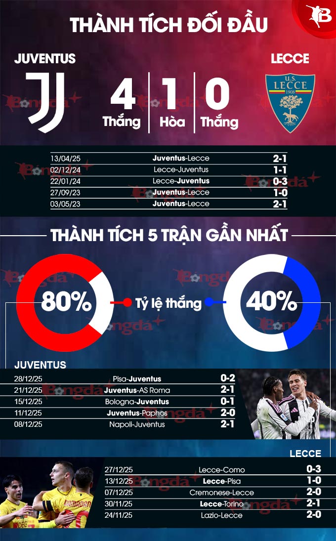 Khi ngay cả việc ghi bàn với Lecce cũng là trở ngại, rất khó để tin rằng họ có thể kiếm được điểm trên sân của "khắc tinh" Juventus. Không chỉ có phong độ tốt hơn, Juventus còn được lịch sử hoàn toàn ủng hộ với chuỗi 10 trận bất bại liên tiếp trước Lecce. Riêng 7 cuộc đụng độ gần đây giữa 2 bên, Lecce để thua tới 6 nên khả năng cao là họ sẽ lại phải ra về với 2 bàn tay trắng.