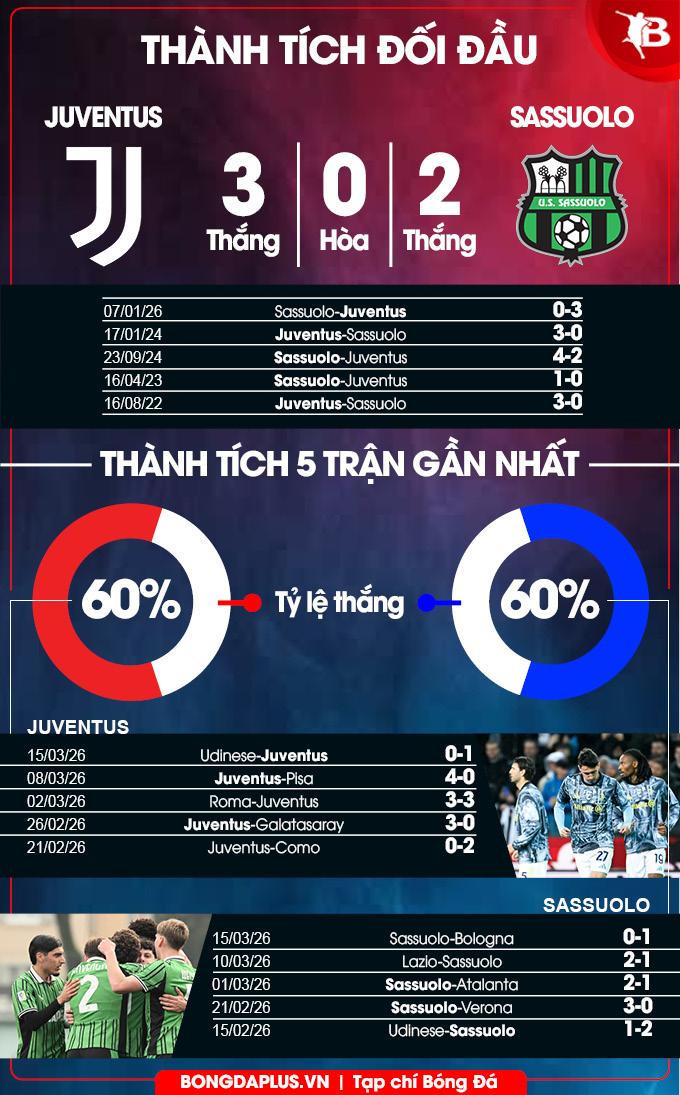 Ngoài ra, Juventus "ăn đứt" Sassuolo ở 10 lần chạm trán trực tiếp gần đây khi thắng 7, thua 3. Riêng 13 lần khi làm khách trước Juventus, Sassuolo thua tới 10, hòa 2 và thắng 1. Nhiều khả năng, 3 điểm sẽ ở lại với "Bà đầm già".