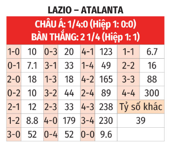 - Từ 2 tới 3 bàn: Cả 3 trận chính thức gần đây khi Lazio được nhường 1/4 đến 1/2 bàn đều có từ 2 tới 3 bàn. Tương tự, 5/7 trận chính thức vừa qua của Atalanta ở các giải đấu nội địa cũng khép lại với tổng bàn thắng rơi vào đoạn từ 2 tới 3.
