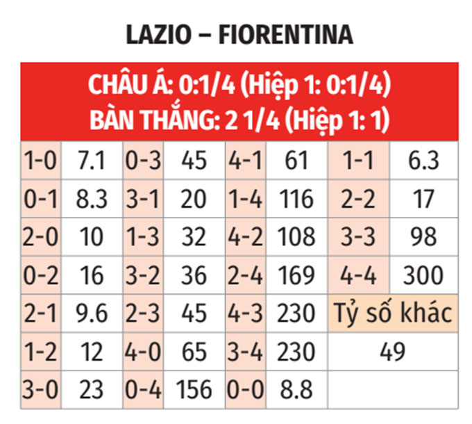 - Hai đội không cùng ghi bàn: 3/4 trận gần nhất của Lazio đều có đội "tịt ngòi". 3/4 trận gần đây của Fiorentina cũng có đội thành công trong việc giữ sạch lưới.