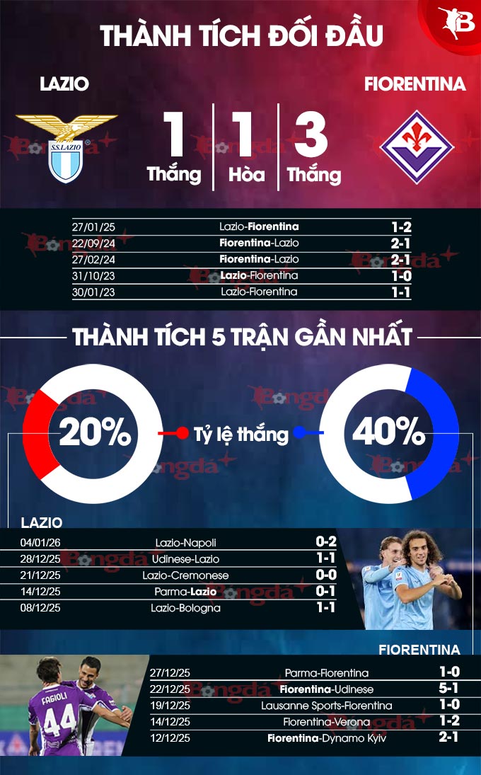 Trong cả 3 trận gặp Fiorentina gần đây, Lazio đều không tránh được thất bại