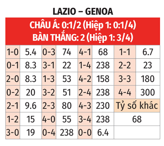 - Lazio thua theo châu Á: Lazio đang tỏ ra kém duyên khi để thua theo châu Á ở 4/5 trận gần nhất. Ở chiều ngược lại, Genoa lại thắng theo châu Á ở 3/4 trận vừa qua nên họ là sự lựa chọn đáng tin cậy.