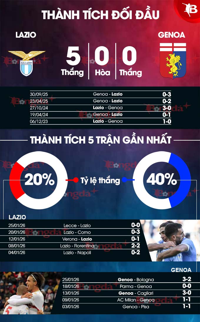 Dưới sự dẫn dắt của tân HLV Daniele De Rossi, Genoa vẫn chưa thua trong 5 trận đấu ở năm 2026. Đáng chú ý, ở vòng đấu trước Genoa từng bị Bologna dẫn trước 2 bàn, nhưng cuối cùng họ vẫn lội ngược dòng thành công để thắng lại 3-2. Từ chỗ phải vất vả lo trụ hạng, Genoa lúc này đã khá an toàn khi đã bỏ xa nhóm "cầm đèn đỏ" tới 6 điểm (23 so với 17). Căn cứ vào thực tế trên, sẽ chẳng bất ngờ nếu Genoa kiếm được điểm từ tay Lazio đang rất chật vật trong việc tìm kiếm chiến thắng.