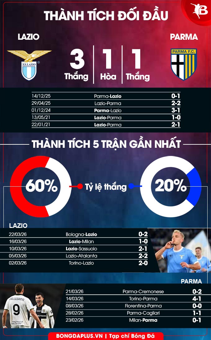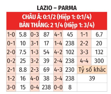 - Cổ vũ Parma: Trong 13 trận chính thức gần đây trên sân khách, Parma có tới 11 lần đem lại niềm vui cho NHM. Sáu trận sân nhà vừa qua khi Lazio nhường đối phương 1/2 bàn trở lên, đội bóng thủ đô đã ngậm ngùi thua theo niêm yết 4 trận. Parma cũng thắng theo niêm yết 4/5 lần chạm trán gần nhất giữa đôi bên. Tương quan thực lực của hai đội khá lớn nhưng Lazio chỉ nhường 1/2 bàn là khá thấp, Parma sẽ giành điểm.