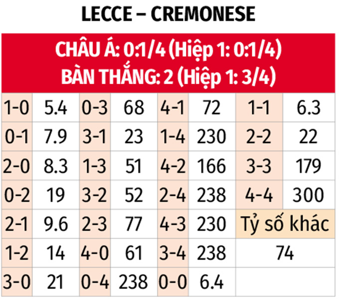 - Tối đa 2 bàn thắng: 3 lần gặp giữa 2 đội gần đây chỉ có nhiều nhất 2 bàn thắng. Tình trạng tương tự xảy ra ở 6/8 trận gần đây của Lecce và 5/7 trận vừa qua của Cremonese. Chờ tỷ lệ hạ xuống 1 3/4 hãy cổ vũ nhiều bàn thắng.