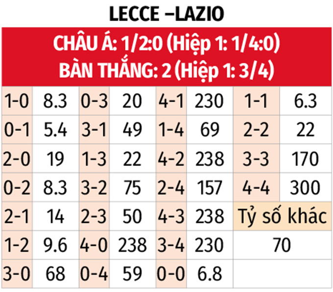 Tối đa 4 góc hiệp 1: 3 trận sân nhà liên tiếp của Lecce cùng 2 trận vừa qua của Lazio có tối đa 3 góc trong hiệp đầu tiên. 3/4 trận đối đầu gần nhất trên sân của Lecce cũng có không quá 4 góc trước giờ nghỉ.