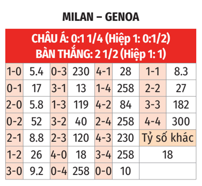 - Milan thua hiệp 1 theo châu Á: Milan thua hiệp 1 theo châu Á ở 4/5 trận gần nhất. Thực tế trên cộng với việc Milan đang có chuỗi 4 trận thua hiệp 1 theo châu Á liên tiếp khi đọ sức với Genoa là lý do các nhà đầu tư không nên ủng hộ đội chủ nhà.