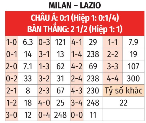 - Milan thắng theo châu Á: Phong độ của Lazio đang nhích lên, nhưng họ vẫn thua 4/6 trận sân khách gần đây. Ngoài ra với phong độ tốt của Lazio nhưng Milan vẫn nhường 3/4 đến 1 bàn là quá sâu. Milan thắng theo châu Á 5/6 trận chính thức vừa qua trên sân nhà, đồng thời thắng theo châu Á 7/8 lần gần nhất tiếp đón Lazio trên sân San Siro ở Serie A khi Milan được đánh giá cao hơn hoặc tỷ lệ châu Á 0:0.