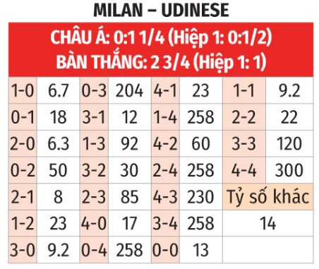 - Udinese thắng theo niêm yết: Milan thua theo niêm yết 6/7 trận sân nhà gần đây ở Serie A khi nhường đối phương 1 đến 1 ¾ bàn. Udinese bất bại theo niêm yết cả 5 trận vừa qua (thắng 4, hòa 1). Udinese thắng theo niêm yết tới 8/10 lần gần nhất chạm trán Milan trên sân San Siro. Tệ lắm thì Udinese cũng chỉ thua Milan với cách biệt sát nút.