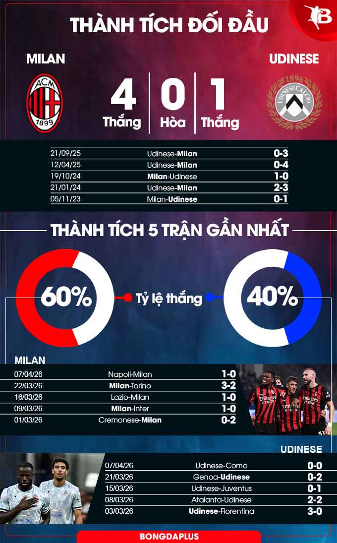 Bongdaplus dự đoán tỉ số Milan vs Udinese