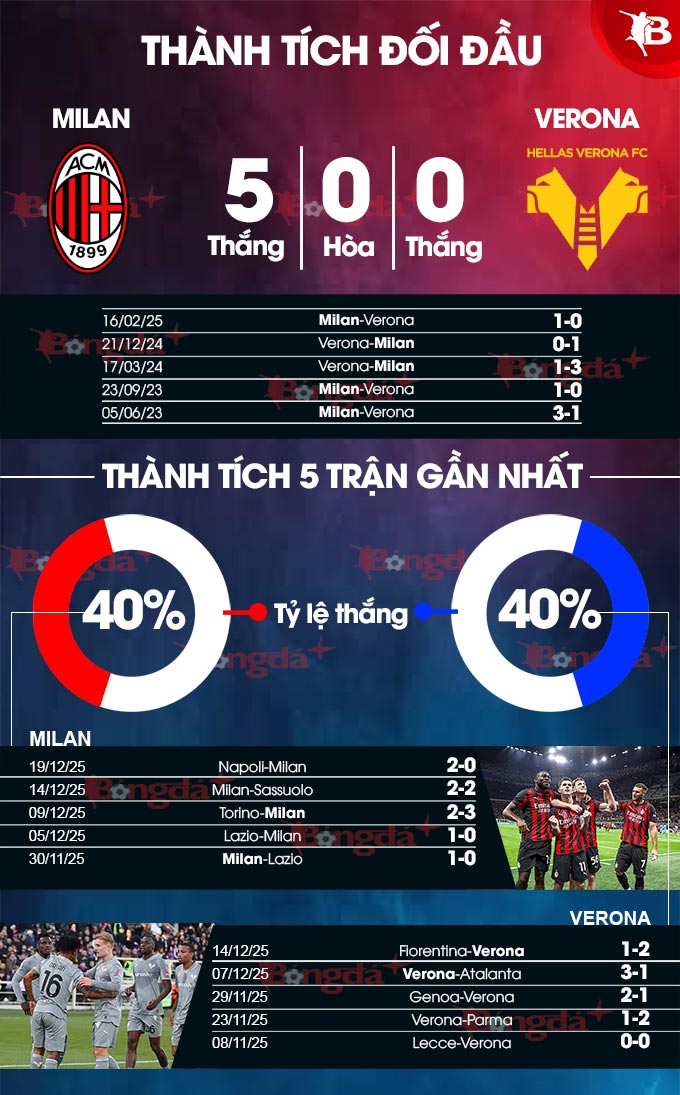 Ngoài ra, Milan cũng đang thi đấu rất xuất sắc trên sân nhà với 2 trận hòa và 5 chiến thắng ở 7 trận gần nhất. Cần nhấn mạnh thêm rằng, Milan bất bại ở 13 lần đụng độ gần nhất với Verona tại Serie A, trong đó có 11 chiến thắng và 2 trận hòa; đặc biệt là chuỗi 9 trận toàn tắng gần nhất.