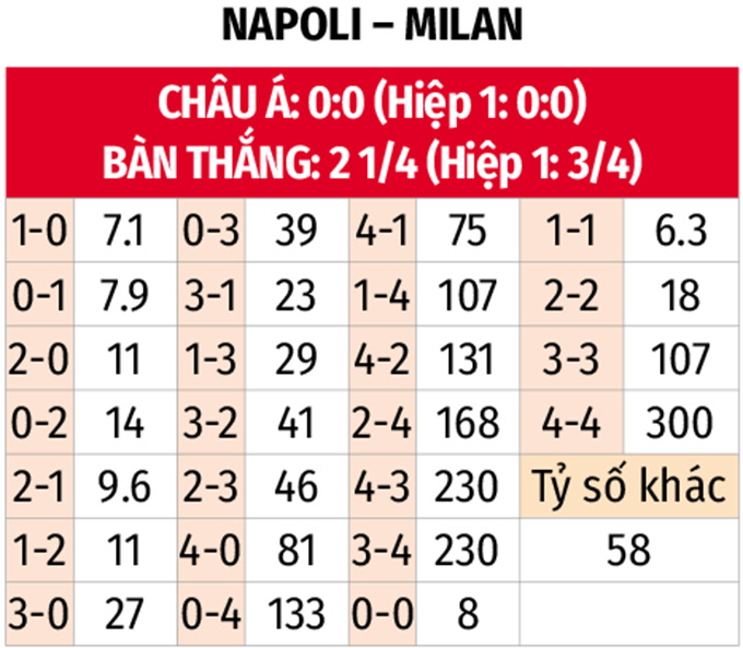 - Napoli thắng châu Á hiệp 1: Các cầu thủ Napoli nhập cuộc rất tốt, thắng châu Á 5 trận liên tiếp gần đây trong hiệp đầu tiên. Với AC Milan, đội khách thua châu Á ở 3/4 trận vừa qua trong 45 phút đầu tiên. AC Milan cũng thua châu Á 3/4 trận đối đầu gần nhất.