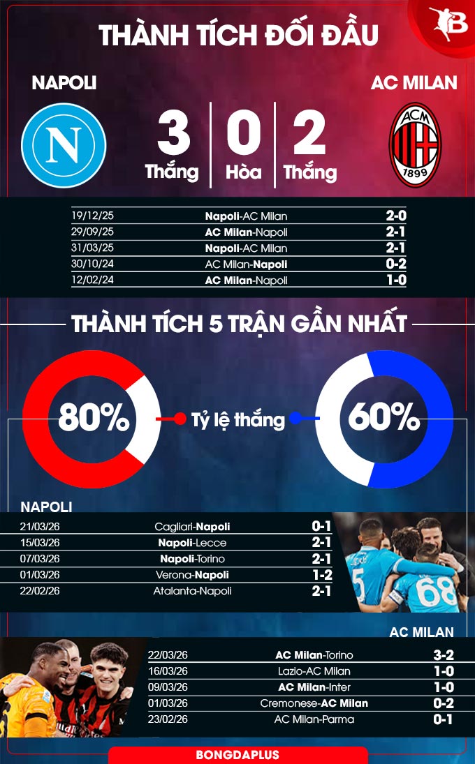 Tuy nhiên, thách thức là không hề đơn giản, khi AC Milan chỉ thua 1 trong 6 lần gần nhất làm khách tại Naples. Đáng nhớ nhất, AC Milan đã gây ra thất bại nặng nề nhất trên sân nhà của Napoli tại Serie A trong 25 năm qua - trận thua 4-0 vào tháng 4/2023. Sự tự tin của Rossoneri ở chuyến làm khách đêm nay cũng là rất lớn khi họ đang có thành tích thắng 3/4 trận đấu gần đây và kém ngôi đầu 6 điểm.