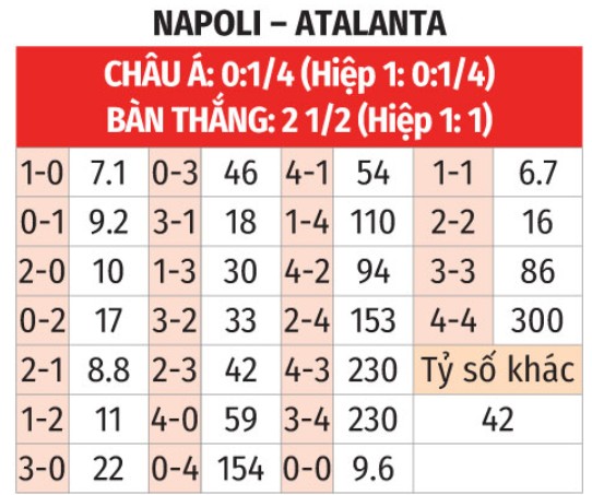 - Atalanta thắng theo châu Á: Atalanta thắng theo châu Á 4/5 trận chính thức gần đây trên sân khách khi được thị trường đánh giá thấp hơn. Napoli thua theo châu Á cả 3 trận chính thức vừa qua, thậm chí không ghi nổi bàn thắng nào. Trong 9 lần đối đầu gần nhất trên sân của Napoli đồng thời họ nhường 1/4 đến 3/4 bàn, Atalanta thắng theo châu Á tới 7 trận.