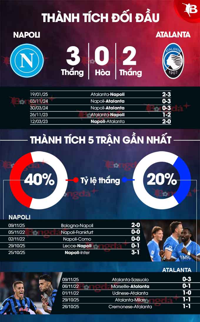 - Ít bàn thắng: 7/8 trận chính thức gần đây của Atalanta chỉ có tối đa 2 bàn thắng, với ngoại lệ duy nhất là thất bại 0-3 trước Sassuolo. Cả 4 trận vừa qua của Napoli đều ít bàn do hàng công suy giảm nghiêm trọng hiệu suất. Trận này sẽ không có quá 2 lần lưới rung.