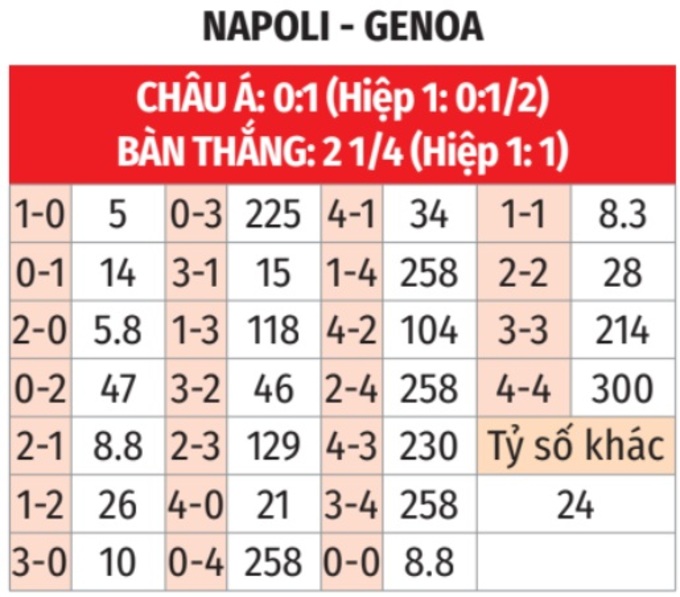 Đặc biệt, Genoa đang sở hữu hàng công “cùn” nhất ở Serie A mùa này. Theo quan sát đến thời điểm hiện tại, họ mới ghi được vỏn vẹn 2 bàn thắng. Với hàng công kém cỏi đó, rất khó để Genoa làm nên bất ngờ trên sân của đối thủ mạnh như Napoli, đặc biệt khi đội chủ nhà có sự trở lại của đội trưởng Giovanni Di Lorenzo ở vị trí hậu vệ phải.