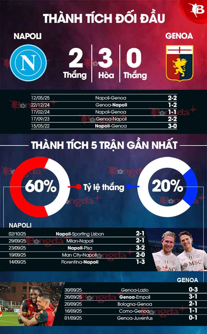- Nhiều bàn thắng cả trận: 8/9 lần gặp giữa 2 đội gần đây đều kết thúc với tối thiểu 3 bàn thắng. Tình trạng tương tự xảy ra ở 4/5 trận gần đây của Napoli và 3 trận gần nhất của Genoa.