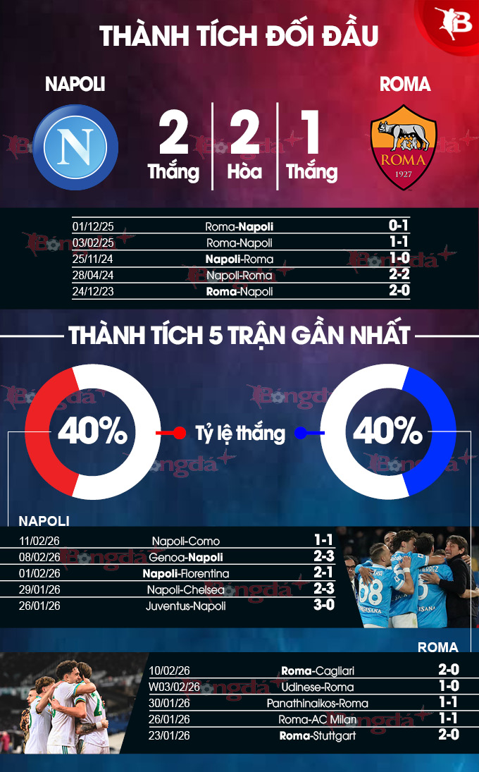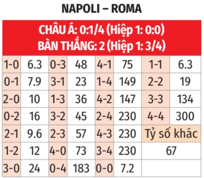 - Lẻ bàn thắng: 4/5 trận đấu gần đây của Napoli kết thúc với tổng số bàn thắng là số lẻ. 10/13 trận sân khách vừa qua của Roma lẻ bàn thắng.