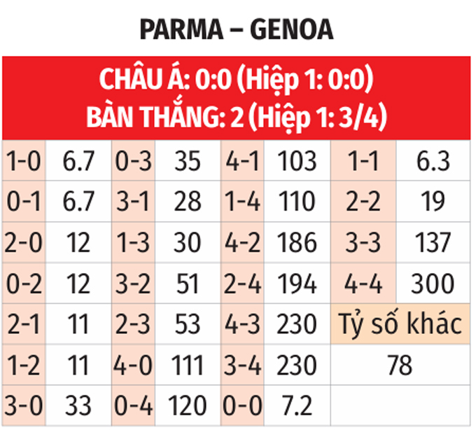 - Chẵn bàn thắng: 7/10 trận so tài gần nhất giữa 2 CLB có tổng bàn thắng chia hết cho 2. Ngoài ra, 7/10 trận vừa qua của Parma cùng 6/7 trận vừa xong của Genoa cũng có tổng bàn thắng là số chẵn. Chưa hết, 6/8 trận Parma tiếp Genoa trên sân nhà đều chứng kiến điều tương tự.