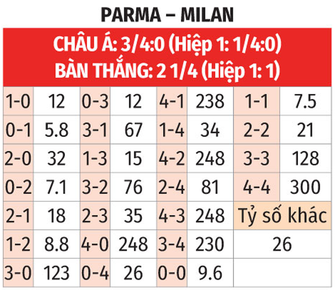 - Chẵn bàn thắng: 7/10 trận gần nhất của Parma tổng bàn thắng chia hết cho 2. Ngoài ra, 3/5 trận vừa qua của Milan chứng kiến điều tương tự.