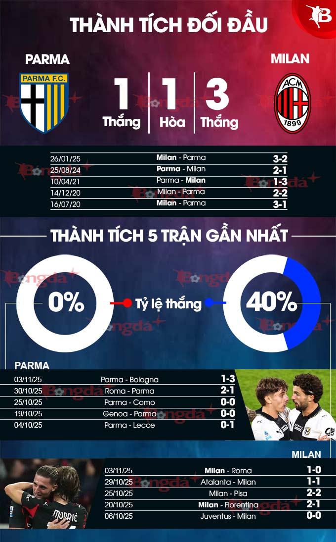 Parma có lợi thế sân nhà nhưng chỉ thắng 2/5 trận mới nhất còn Milan bất bại ở sân khách kể từ khi mùa giải mới khởi tranh. Hơn nữa, họ còn "ăn đứt" đối thủ ở khoản đối đầu trực tiếp.