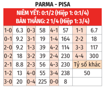 - Pisa từ hòa đến thắng: Pisa thắng theo niêm yết 5/6 trận sân khách gần đây ở Serie A khi được nhường 1/4 đến 1/2 bàn. Parma là đội rất cứng đầu trước các đối thủ mạnh, nhưng họ không thắng 4/5 trận chính thức vừa qua trên sân nhà khi là đội mạnh hơn. Ngoài việc Parma thua theo niêm yết 3/4 lần gần nhất tiếp đón Pisa trên sân nhà, Parma còn hơn đối thủ tới 21 điểm trên BXH nhưng chỉ nhường 1/4 đến 1/2 là quá thấp đến mức bất thường. Pisa sẽ có điểm.