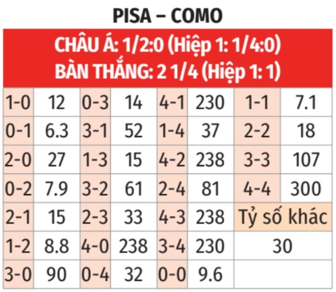 - Tối thiểu 1 bàn hiệp 1: 8 lần đối đầu giữa 2 đội gần đây đều có từ 1 bàn thắng trở lên trong hiệp 1. Tình trạng tương tự xảy ra ở 5/6 trận gần đây của Como và 2/3 trận mới nhất của Pisa.