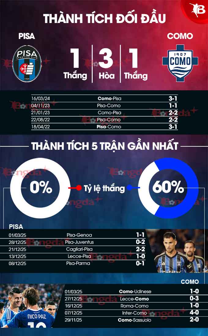 - Chẵn bàn thắng: 5 lần chạm trán giữa 2 đội gần đây kết thúc với tổng số bàn thắng là số chẵn. Tình trạng tương tự xảy ra ở 5/7 trận gần đây của Pisa và 10/13 trận vừa qua của Como.