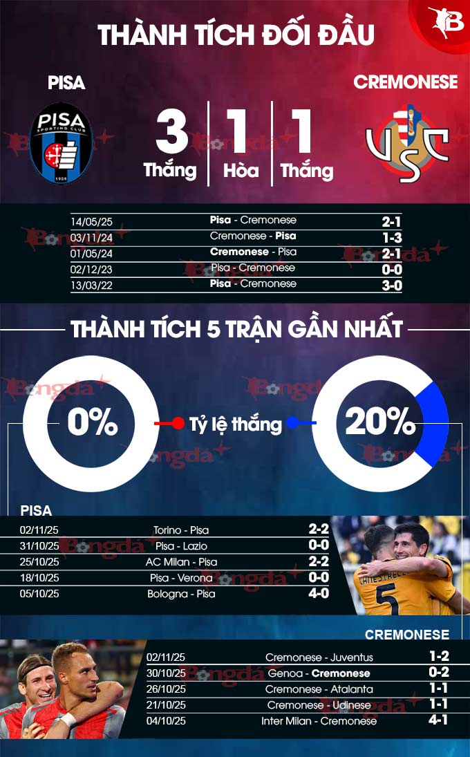 - Tỷ số chẵn: Cả 6 trận vừa qua của Pisa đều kết thúc với tỷ số chẵn. 3/4 trận gần đây của Cremonese cũng có số bàn thắng chia hết được cho 2.