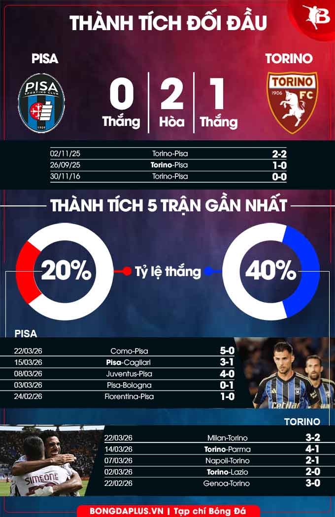- Hai đội cùng ghi bàn: 4/5 trận sân nhà gần nhất của Pisa và 6/8 trận gần đây của Torino đều có ít nhất 1 bàn thắng cho mỗi đội. Ngoài ra, 3/4 chuyến làm khách vừa qua của Torino cũng đều khép lại mà không đội nào giữ sạch lưới nhà.