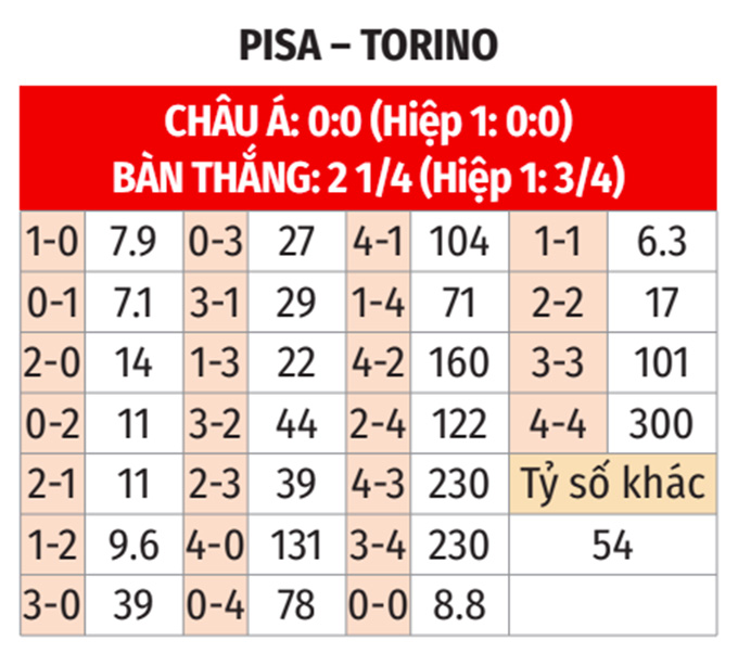 - Hiệp 1 có bàn thắng: 6/9 trận gần nhất của Pisa và 17/20 trận vừa qua của Torino đều có ít nhất 1 bàn thắng trong hiệp 1. Hơn nữa, cả 8 chuyến làm khách gần đây của Torino cũng sẽ có kịch bản tương tự trong hiệp đấu đầu tiên.