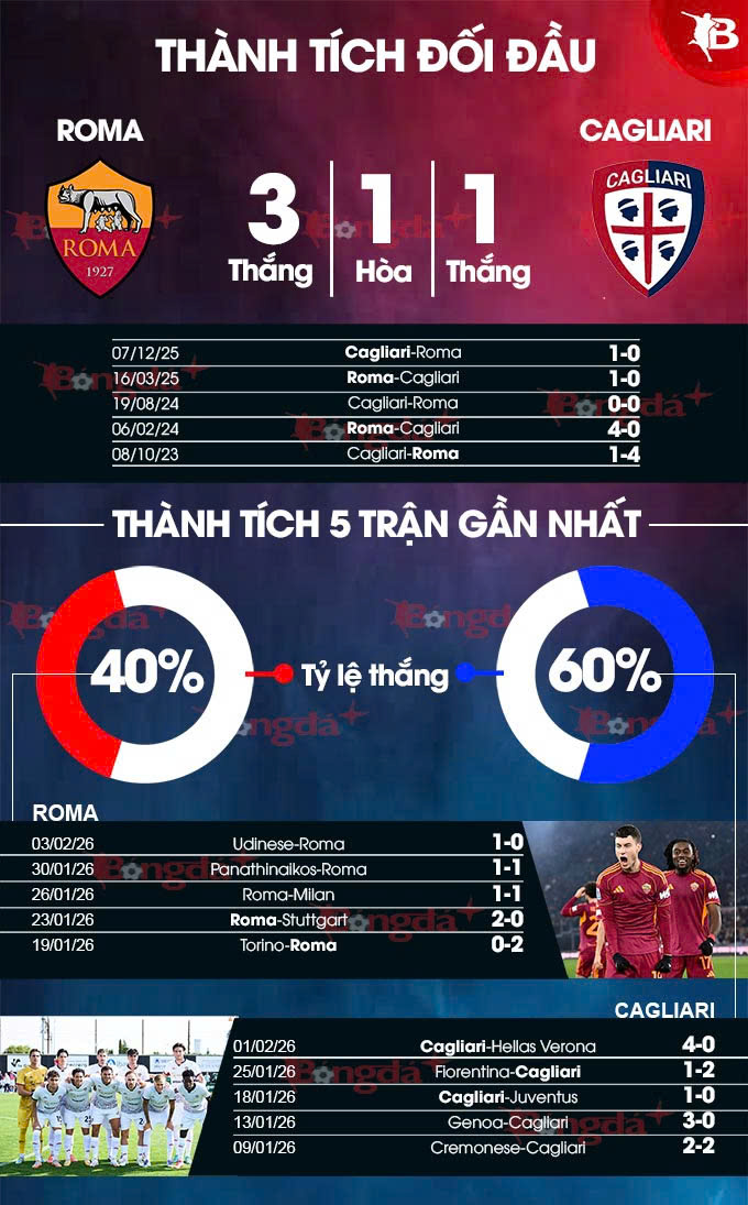 Riêng khi tiếp đón Cagliari trên sân nhà, Roma bất bại 10 trận liên tiếp với thành tích thắng 8 và hòa 2. Xem ra, lần này Cagliari sẽ lại tay trắng rời sân Olimpico.