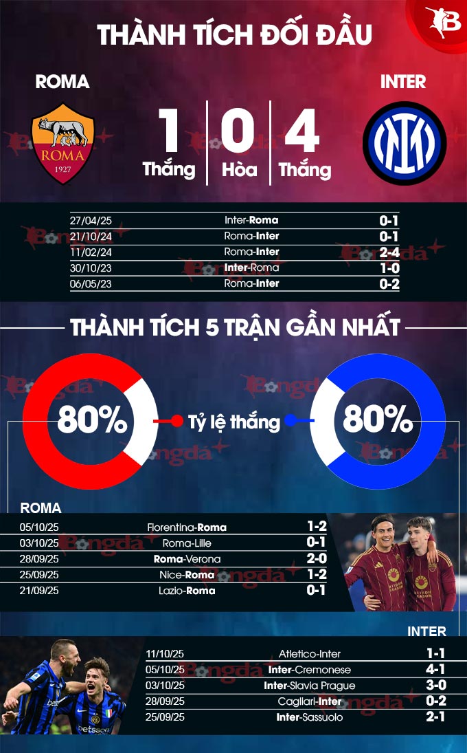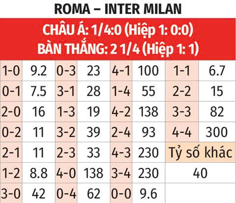 - Roma thắng theo châu Á: Roma thắng theo châu Á 10/13 trận chính thức gần đây. Tuy Inter đang có phong độ tốt nhưng nhìn chung mùa này thầy trò Chivu chưa cho thấy họ vững vàng trước các đối thủ mạnh. Thầy trò Gasperini đủ sức giành ít nhất 1 điểm.