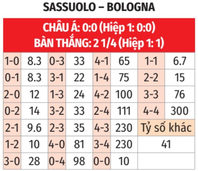 - Lẻ bàn thắng: 7/8 trận đấu gần đây của Sassuolo kết thúc với tổng bàn thắng là số lẻ. 10/12 trận vừa qua của Bologna xảy ra tình trạng tương tự.