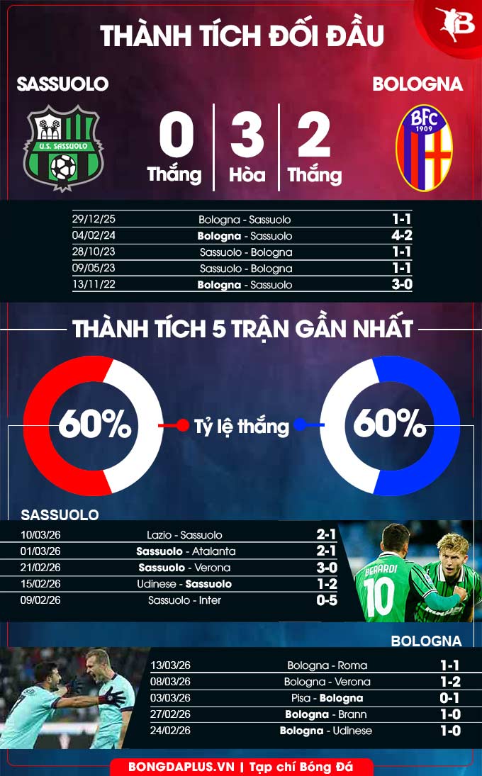 Trong khi đó, Bologna đang có dấu hiệu chững lại. Họ không thắng 2 trận liên tiếp gần đây gồm 1 trận thua và 1 trận hòa. Những kết quả đó khó có thể giúp họ tự tin hành quân đến sân của Sassuolo.