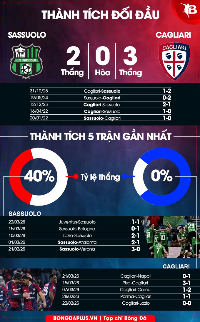 Trên sân đối phương, Cagliari mới thắng 3, hòa 5 và thua tới 7 trận sau 15 chuyến xa nhà tại Serie A mùa này. Thành tích kém cỏi khiến Cagliari bị nhấn chìm trên BXH. Vì thế, nhiều khả năng họ tiếp tục trắng tay khi rời Sassuolo lần này.