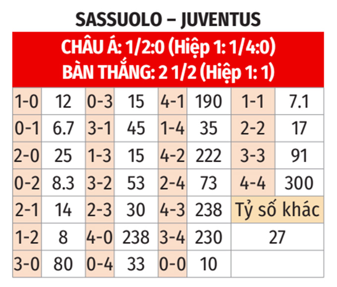 - Juventus ghi bàn hiệp 1: Juventus ghi ít nhất 1 bàn thắng ở 6/8 cuộc đối đầu gần nhất, ở 10/12 chuyến làm khách gần đây tại Sassuolo. Hơn nữa, Sassuolo lại luôn để thủng lưới trong hiệp 1 ở 5/7 trận gần đây, ở 5/6 trận sân nhà vừa qua.