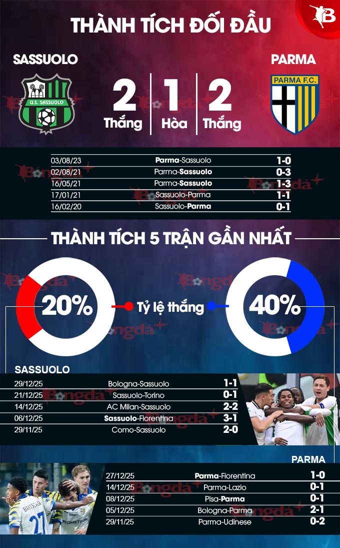 - Ít bàn thắng: 3/4 trận gần đây của Sassuolo cùng 3 trận liên tiếp vừa qua của Parma đều có tối đa 2 pha làm bàn. 5/7 trận đối đầu gần nhất cũng có thống kê tương tự.