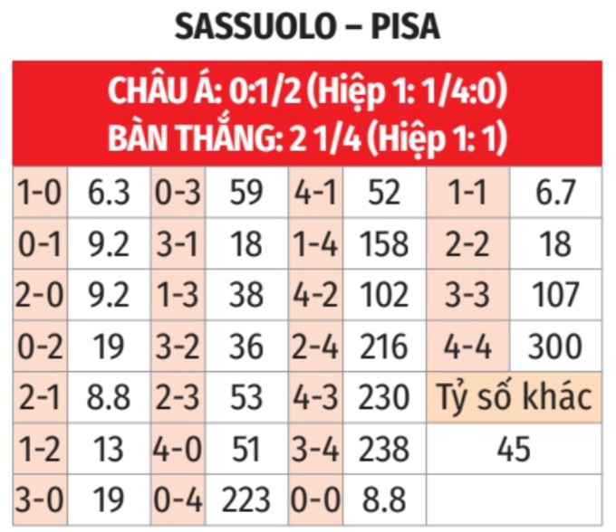 - Tối thiểu 1 bàn hiệp 1: 3/4 lần gặp giữa 2 đội gần đây đều có ít nhất 1 bàn thắng trong hiệp 1. Tình trạng tương tự xảy ra ở 6/7 trận sân nhà gần đây của Sassuolo và 6 trận sân khách mới nhất của Pisa.