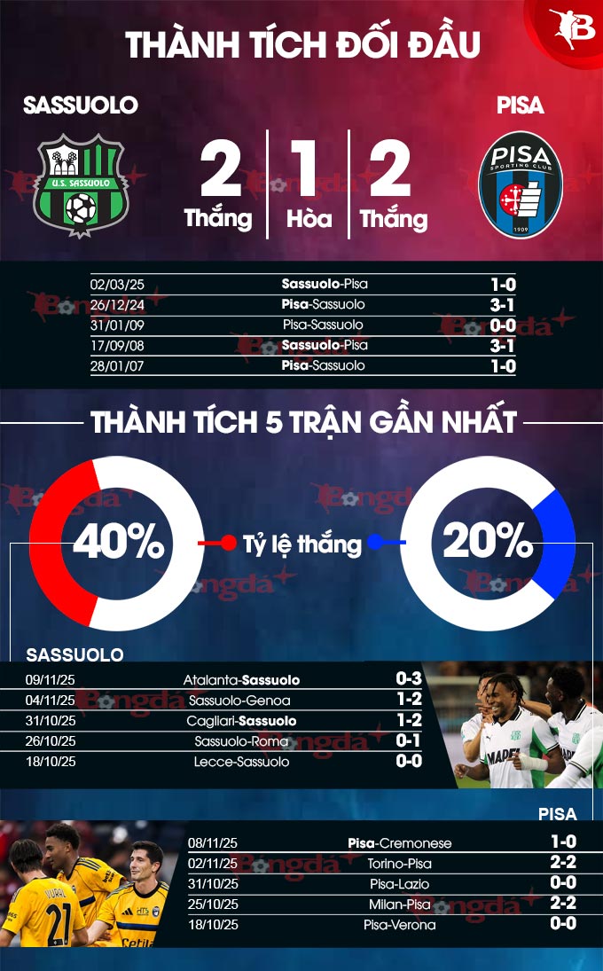 Với phong độ kém cỏi đó, Pisa có lý do để lo lắng khi hành quân đến sân của Sassuolo trong trận đấu muộn của vòng 12 Serie A. Nên nhớ rằng, trong 10 chuyến hành quân vừa qua tại các giải chính thức, Pisa đều không thể giành thắng lợi.