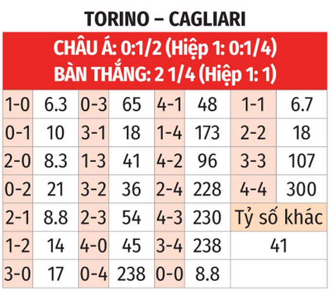 Kể từ khi mùa giải mới khởi tranh, Cagliari chỉ thắng 1/8 trận làm khách. Còn lại, họ thua 4 và hòa 3. Do đó, khả năng cao Torino sẽ giành trọn 3 điểm.