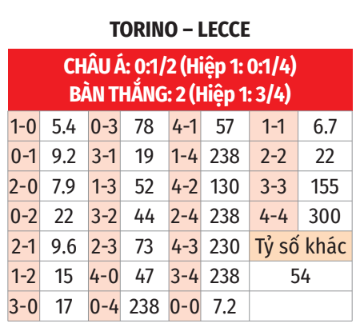 Điều may mắn cho Torino là cặp đấu này có xu hướng đãi đội mạnh hơn. Cộng thêm với tỷ lệ nhường khá sâu so với thực lực, Torino sẽ có 90 phút thăng hoa để bỏ lại Lecce ở phía sau trong cuộc đua trụ hạng.