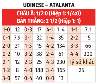 - Udinese thắng theo châu Á: Atalanta không thắng theo châu Á cả 5 trận chính thức gần đây (thua 4, hòa 1). Trong 6 lần gần nhất đón tiếp Atalanta trên sân nhà, thành tích theo châu Á của Udinese là thắng 3, hòa 2, thua 1. Atalanta đang rơi vào chuỗi trận chia điểm không dứt, sẽ không ngạc nhiên nếu họ tiếp tục mất điểm ở Udine.