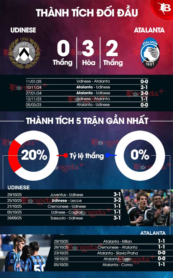 Udinese vừa thảm bại 1-3 trên sân của Juventus. Nhưng ở mùa giải này đội quân của HLV Kosta Runjaic chưa từng thua 2 trận liên tiếp. Ngoài ra trong 6 lần đối đầu gần nhất, Udinese đã có tới 4 lần đạt được kết quả hòa trước Atalanta.