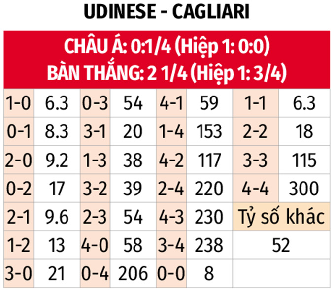 - Ít nhất 1 bàn thắng hiệp 1: 4 trận liên tiếp gần đây của Cagliari cùng 5 trận vừa qua của Udinese đều xuất hiện ít nhất 1 bàn thắng trong hiệp đầu. Lịch sử cũng ghi nhận 5/7 trận gặp nhau giữa đôi bên có bàn thắng trước giờ nghỉ.