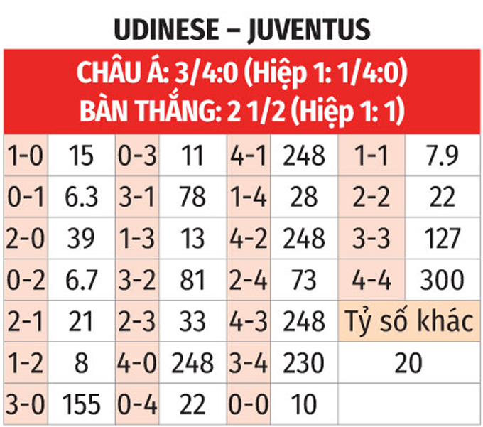 - Lẻ bàn thắng: 5/6 trận gần nhất của Udinese có tổng bàn thắng không chia hết cho 2. Chưa hết, 7/10 trận sân khách vừa xong của Juventus chứng kiến điều tương tự. Ngoài ra, 4/6 trận vừa qua khi Udinese tiếp Juventus trên sân nhà có tổng bàn thắng lẻ.