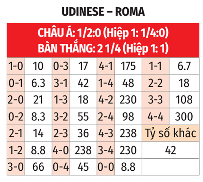 - Tối đa 2 bàn: 3/4 trận sân nhà gần đây của Udinee đều chỉ có tối đa 2 bàn. Cả 4 trận vừa qua của Roma số lần lưới rung cũng không lên được tới 3.